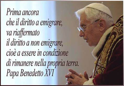 Ratzinger: approccio lucido e profetico: “Prima ancora che il diritto a emigrare, va riaffermato il diritto a non emigrare”. Benedetto XVI rifletteva anche sul fatto che - a certe condizioni - "migrare diventa allora un 'calvario' per la sopravvivenza, dove uomini e donne appaiono più vittime che autori e responsabili della loro vicenda migratoria". E ancora: "Il cammino di integrazione comprende diritti e doveri, attenzione e cura verso i migranti perché abbiano una vita decorosa, ma anche attenzione da parte dei migranti verso i valori che offre la società in cui si inseriscono".